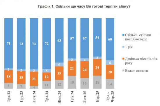 Большинство опрошенных «КМИС» украинцев готовы к длительной войне с агрессором: 60% респондентов из 1011 опрошенных (606 человек) заявили, что готовы «терпеть столько, сколько нужно», чтобы достичь победы.