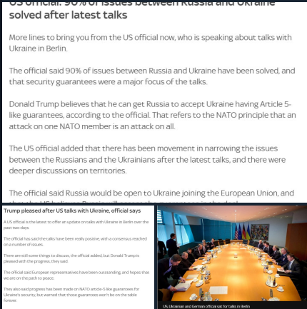 По словам чиновника, Дональд Трамп считает, что сможет убедить Россию принять гарантии, аналогичные статье 5, предоставляемые Украине. Чиновник также сказал, что в Берлине был достигнут прогресс по данному пункту, но предупредил, что эти гарантии не будут находиться на столе вечно.
