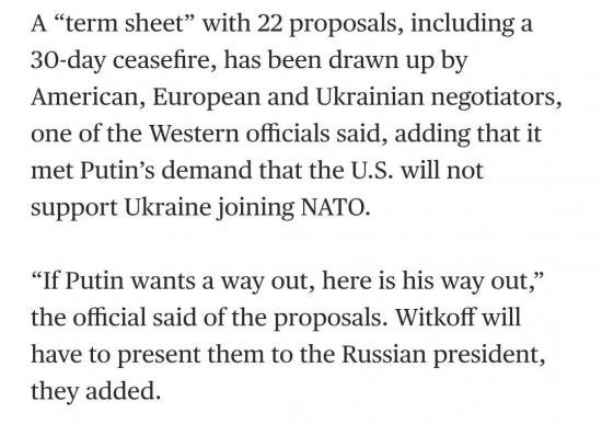«Если Путин хочет выхода, вот его выход», — сказал чиновник о предложениях. Уиткофф должен будет представить их российскому президенту, добавил он.