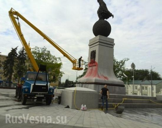 осквернили памятник Независимости Украины, а конкретнее: надпись "Слава Украине" на фасаде статуи.