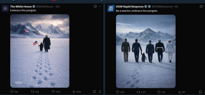 Их аккаунты в Х опубликовали ИИ-картинки, на которых Трамп и американские военные идет рука-об-руку с пингвином по ландшафту, напоминающему Гренландию и с флагом Гренландии на дальнем фоне.
