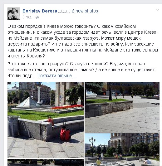 "О каком порядке в Киеве можно говорить? О каком хозяйском отношении, и о каком уходе за городом идет речь, если в центре Киева, на Майдане, та самая булгаковская разруха. Может мэру мешок церезита подарить? И не надо все списывать на войну. Или засохшие каштаны на Крещатике и отпавшая плитка на Майдане это тоже сепары и агенты Кремля?