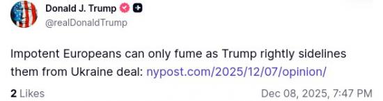 Публикация New York Post под названием «Бессильные европейцы могут только злиться, когда Трамп справедливо отстраняет их от украинской сделки», которую перепостил Трамп, – это колонка мнения научного сотрудника Института исследований внешней политики Доминика Грина.