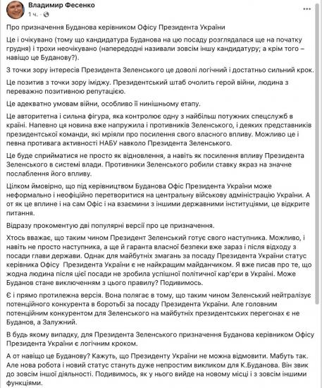 Однако для будущих соревнований за пост президента Украины статус руководителя Офиса президента Украины является не лучшей площадкой. Я уже писал о том, что ни один человек после этой должности не сделал успешной политической карьеры в Украине. Может Буданов станет исключением из этого правила? Посмотрим», - пишет Фесенко.