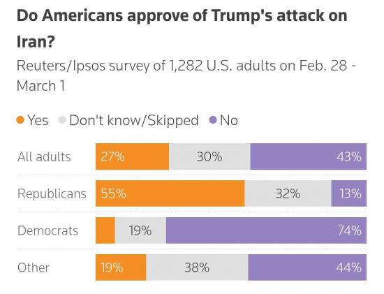 По данным опроса Reuters/Ipsos, 43% респондентов не одобряют эти действия, тогда как 27% поддерживают их, еще 29% затруднились с ответом.