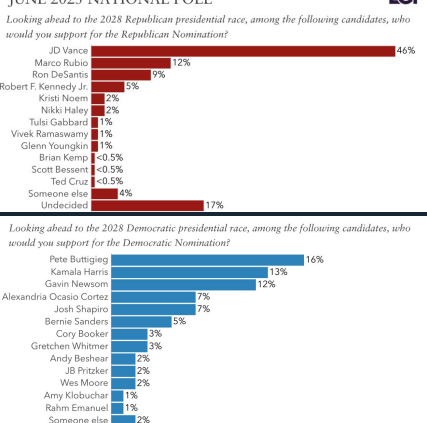 У демократов нет такого явного лидера - там на первом месте уже бывший министр транспорта Пит Буттиджич с 16%, а проигравшая Трампу Камал Харрис на втором месте с 13%. За ними идут губернатора Калифорнии Гэвин Ньюсом - 12%, губернатор Пенсильвании Джош Шапиро и член Палаты представителей Александрия Окасио-Кортес - по 7%.