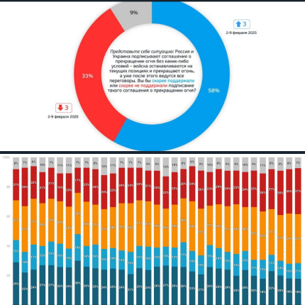 58% опрошенных заявили, что поддерживают подписание соглашения о прекращении огня без каких-либо условий, после чего начинаются переговоры. Это на 3% больше, чем было полгода назад.