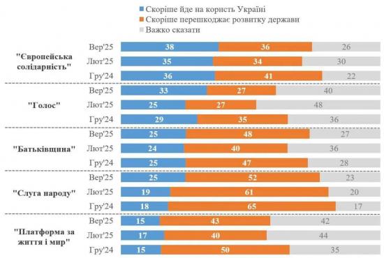 Наиболее позитивно респонденты относятся к фракции «Европейская солидарность»: 38% считают, что её деятельность идёт на пользу Украине, 36% — придерживаются противоположного мнения.