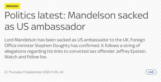Британия уволила своего посла в США Питера Мандельсона из-за связи с сексуальным преступником Эпштейном, - Sky News