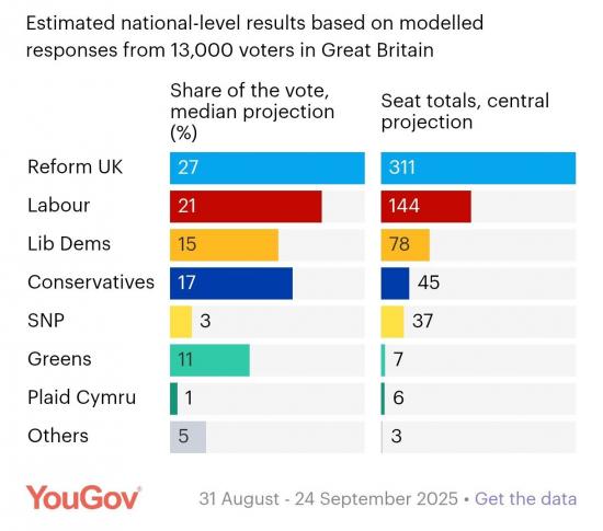 Британская ультраправая партия Reform UK будет в шаге от получения большинства в парламенте - если выборы состоятся сейчас