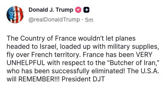 "Франция была крайне неполезной в отношении «Мясника Ирана», который был успешно ликвидирован! США это запомнят!" - написал президент США.