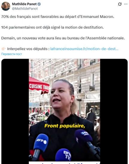 Об этом сообщила в соцсети Х лидер партии «Непокорившаяся Франция» Матильда Пано.