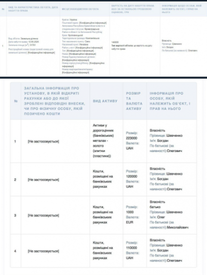 Бывший водитель Кировоградского областного ТЦК Богдан Шевченко задекларировал в 2025 году золотые слитки на 220 тыс. грн.