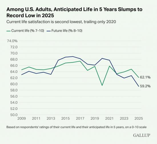 По данным опроса, доля взрослых американцев, считающих, что их жизнь в следующие пять лет будет благополучной составила 59,2%, что стало самым низким показателем за почти два десятилетия.
