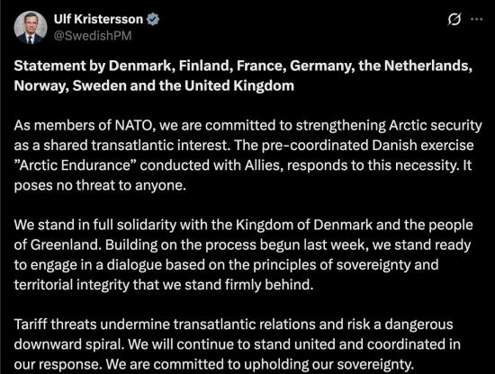 «Тарифные угрозы подрывают трансатлантические отношения и грозят опасной нисходящей спиралью. Мы будем и впредь действовать единодушно и скоординированно. Мы привержены защите нашего суверенитета», - заявили Дания и ее союзники.