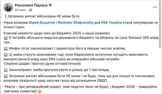 Однако эти изменения, как пишет Пидласа, станут возможными, если Евросоюз разрешит использовать выделенные им 6 млрд евро на зарплаты военным. По словам нардепа, прогноз на это оптимистичен (ранее в интервью она отмечала, что это политически проблематично для правительств стран ЕС).
