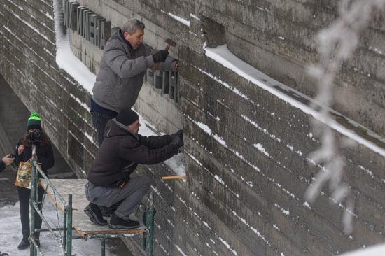 Примечательно, что буквы полез сбивать с молотком лично директор музея, 60-летний Юрий Савчук.