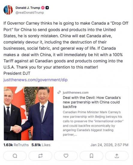 Дональд Трамп угрожает Канаде 100% пошлинами в случае если она заключит торговое соглашение с Китаем