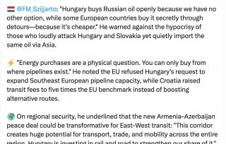 «Венгрия открыто закупает российскую нефть, потому что у нас нет другого выбора, в то время как некоторые европейские страны покупают ее тайно, используя обходные пути, потому что так дешевле» , - заявил министр иностранных дел...