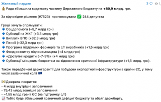 Верховная Рада увеличила расходную часть госбюджета, направив дополнительные 80,9 млрд грн на социальную поддержку населения и восстановление критической инфраструктуры.