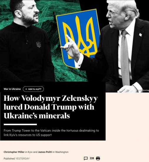 Трамп отреагировал с «интересом», но украинцы "и представить себе не могли, насколько безжалостно Трамп будет заинтересован в украинских полезных ископаемых и насколько катастрофическими могут стать переговоры для Киева, президента Зеленского и перспектив сдерживания российского вторжения".