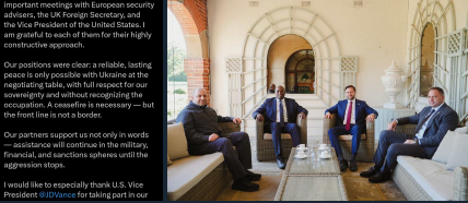 "Наша позиция была ясной: надёжный и прочный мир возможен только при участии Украины за столом переговоров, с полным уважением нашего суверенитета и без признания оккупации. Перемирие необходимо — но линия фронта не является границей", - написал глава ОП.