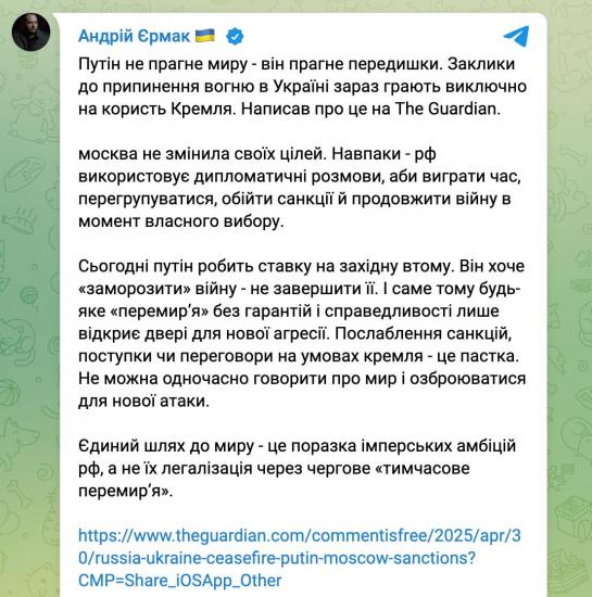 Правда, сам Ермак опубликовал приведенный выше текст как подводку к своей колонке в «Гардиан», в которой он подтвердил готовность Украины к 30-дневному перемирию и раскритиковал идею Путина объявить перемирие на три дня с 8 по 10 мая.