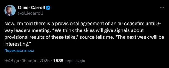 Есть предварительное соглашение о прекращении огня в воздухе ещё до трехсторонней встречи Зеленского, Трампа и Путина