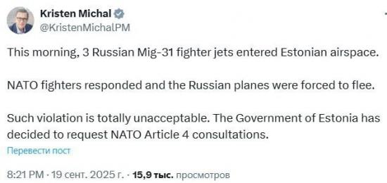 Эстония запросила консультации НАТО по статье 4 в связи с нарушением их воздушного пространства российскими истребителями
