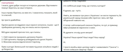 «Давайте теперь подумаем: кто больше всего радуется тому, что произошло сегодня? Я думаю, что – Путин. Представьте, вы воевали три года с Украиной и не могли победить, потому что украинский народ показал себя героически и весь мир объединился вокруг нас. А теперь самый главный союзник Украины, по сути, в прямом эфире разорвал все отношения с нами. Как вы думаете: кто от этого выиграет? Украина? Наша армия? Наши люди? Наш народ? Нет. И просто какой-то верх цинизма сидеть и нахваливать «Саныча» из теплых киевских квартир и баров. У меня нет слов», – также написал Гончаренко.