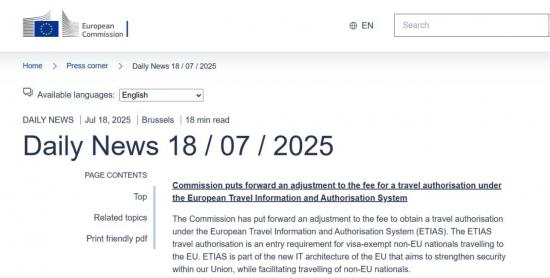 Еврокомиссия собирается повысить почти втрое плату за разрешение на поездку в ЕС в рамках Европейской системы информации и авторизации путешествий (ETIAS), которая заработает в конце 2026 года