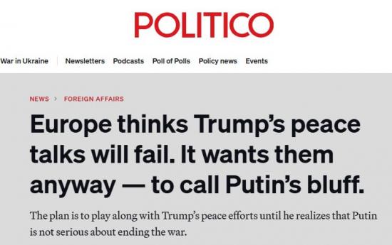 Ее лидеры считают, что переговоры следует продолжать, чтобы Трамп понял, что Путин блефует. План Европы - подыгрывать Трампу, хвалить его и потакать ему, пока он сам не осознает, что Путин не хочет прекращения войны.