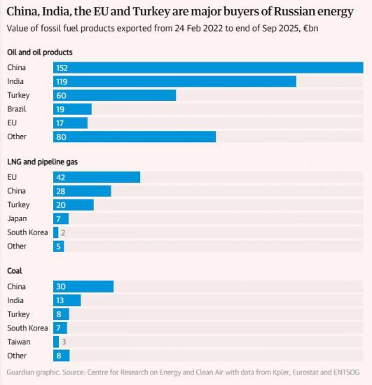 За ним следуют Китай (22%) и Япония (18%). Блок также является крупнейшим покупателем трубопроводного газа, закупая 35% российского трубопроводного газа. За ним следуют Китай (30%) и Турция (29%). Венгрия и Словакия были крупнейшими импортёрами российского газа в ЕС в прошлом месяце, закупив российского ископаемого топлива на сумму 393 млн евро и 207 млн евро соответственно. Франция, Бельгия и Нидерланды также продолжили импорт российского газа. Франция была третьим по величине покупателем российского газа в ЕС в прошлом году, импортировав 153 млн евро российского ископаемого топлива, всё в виде СПГ, часть которого впоследствии была поставлена в Германию.