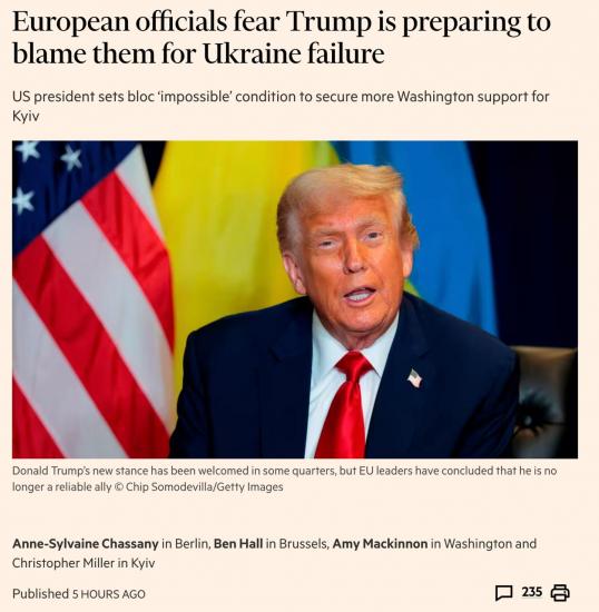 Европейцы опасаются, что Трамп готовится обвинить их в провале Украины, и больше не считают его надежным союзником