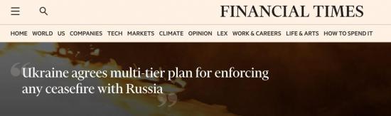 Financial Times со ссылкой на источники пишет, что Украина, США и страны Европы согласовали «многоуровневый план поддержки» возможного мирного соглашения между Москвой и Киевом