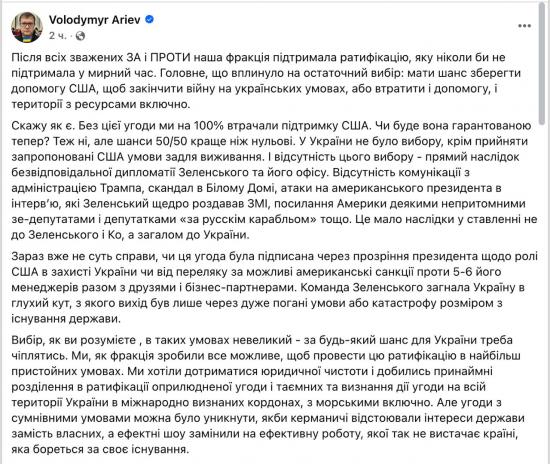 "Главное, что повлияло на окончательный выбор: иметь шанс сохранить помощь США, чтобы закончить войну на украинских условиях, или потерять помощь и территории с ресурсами включительно. Без этого соглашения мы на 100% теряли поддержку США", - пишет нардеп "Евросолидарности" Арьев.