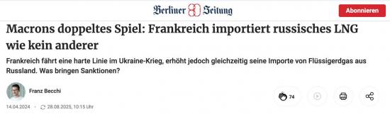 «Не может быть так, что Франция, с одной стороны, занимает жесткую позицию по отношению к России, а с другой — платит огромные суммы за российский газ», — заявил анонимный дипломат из ЕС.