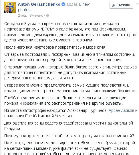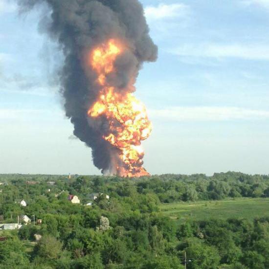 "Сегодня в 8 утра, во время попытки локализации пожара на нефтебазе фирмы "БРСМ" в селе Крячки, что под Васильковым, произошел мощный взрыв одной из емкостей с топливом, от которого сдетонировали остальные емкости с горючим.