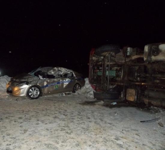 Навстречу автоколонне по дороге двигались два автомобиля, груженые щебнем. Водитель одного из них, увидев проблесковые маячки патрульного автомобиля, сбросил скорость, пропуская автоколонну. Однако следующий за ним водитель не выдержал безопасную дистанцию, в результате чего произошло столкновение, после чего один из автомобилей вынесло на полосу встречного движения.