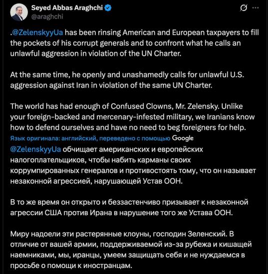 «Зеленский обчищает американских и европейских налогоплательщиков, чтобы набить карманы своих коррумпированных генералов и противостоять тому, что он называет незаконной агрессией, нарушающей Устав ООН. В то же время он открыто и беззастенчиво призывает к незаконной агрессии США против Ирана в нарушение того же Устава ООН. Миру надоели эти растерянные клоуны, господин Зеленский. В отличие от вашей армии, поддерживаемой из-за рубежа и кишащей наемниками, мы, иранцы, умеем защищать себя и не нуждаемся в просьбе о помощи к иностранцам», - написал глава МИД страны Арагчи.