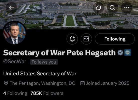 Глава Пентагона Пит Хегсет изменил описание своей страницы в Х на «Министр войны Пит Хегсет»