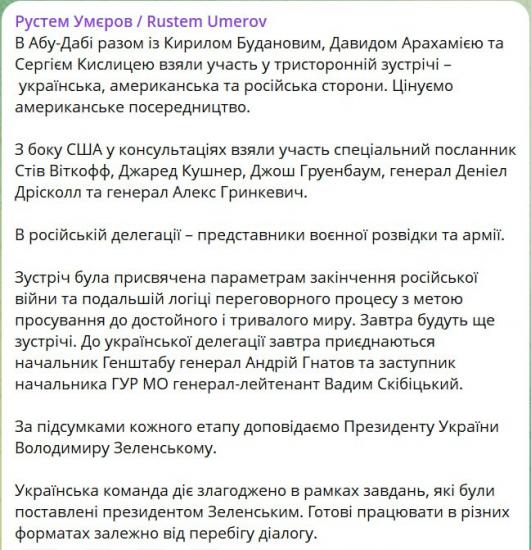 Глава украинской делегации в Абу-Даби Умеров заявил, что переговоры с США и РФ продолжатся завтра