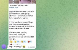 Об этом сегодня сообщили СМИ со ссылкой на проект госбюджета-2026, в котором сказано, что в 2024 году "Укрпочта" зафиксировала убыток в 413,2 млн гривен (против 796,4 млн гривен в 2023 году).