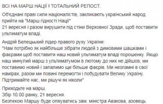 Объединенные правые силы националистов собирают людей на «Марш достоинства нации». Об этом написал активист Захар Байда на своей странице в «Facebook».