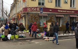Украинцы в соцсетях обсуждают фотографию, сделанную на Подоле в Киеве. Объектом съемки стал один из магазинов "Roshen" и обнищавшие пенсионеры, которые торгуют под его стенами продуктами.