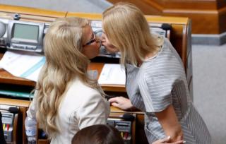 В Сеть попали фотографии, как во время заседания парламента лидер "Батькивщины" Юлия Тимошенко была замечена за поцелуем в губы со своей коллегой Еленой Кондратюк.