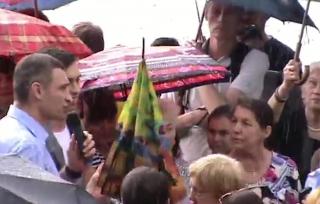 В Сети появилось забавное видео, на котором внезапный природный катаклизм застал мэра украинской столицы без зонта на торжественном открытии фонтана.