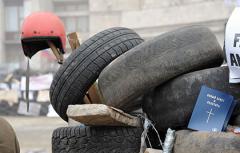 Валютные заемщики, собравшиеся у здания Верховной Рады на акцию протеста с требованием пересмотра условий кредитования, принесли на площадь покрышки.