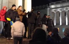 Около 100 митингующих в балаклавах и с железными цепями в руках перекрывали улицу Крещатик в Киеве.