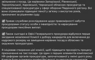 Сообщается, что в отставку ушли руководители Запорожской, Ровенской, Тернопольской, Харьковской, Черкасской областных прокуратур и специализированной прокуратуры в сфере обороны Южного региона.